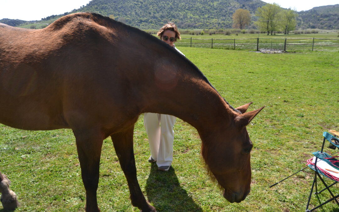 Sobre los caballos te diré que son los auténticos facilitadores, yo como humana hago de puente entre ellos y los participantes por eso deben vivir en un estado lo más natural posible, en tiempo de caballo, me encanta pasar tiempo con ellos sin hacer (nada) solamente estar ahí, sentada en una piedra observándolo, permitiendo que se acerquen, me toquen, me huelan, jugando, meditando entre ellos……